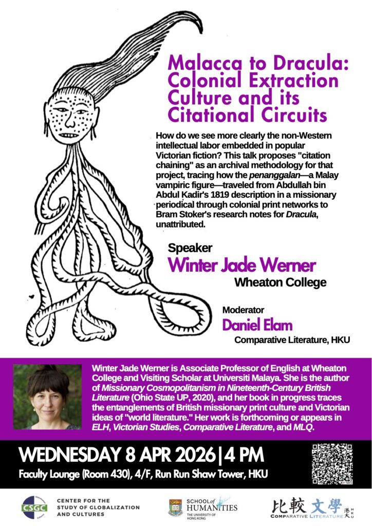 How do we see more clearly the non-Western intellectual labor embedded in popular Victorian fiction? This talk proposes “citation chaining” as an archival methodology for that project, tracing how the penanggalan—a Malay vampiric figure—traveled from Abdullah bin Abdul Kadir’s 1819 description in a missionary periodical through colonial print networks to Bram Stoker’s research notes for Dracula, unattributed.